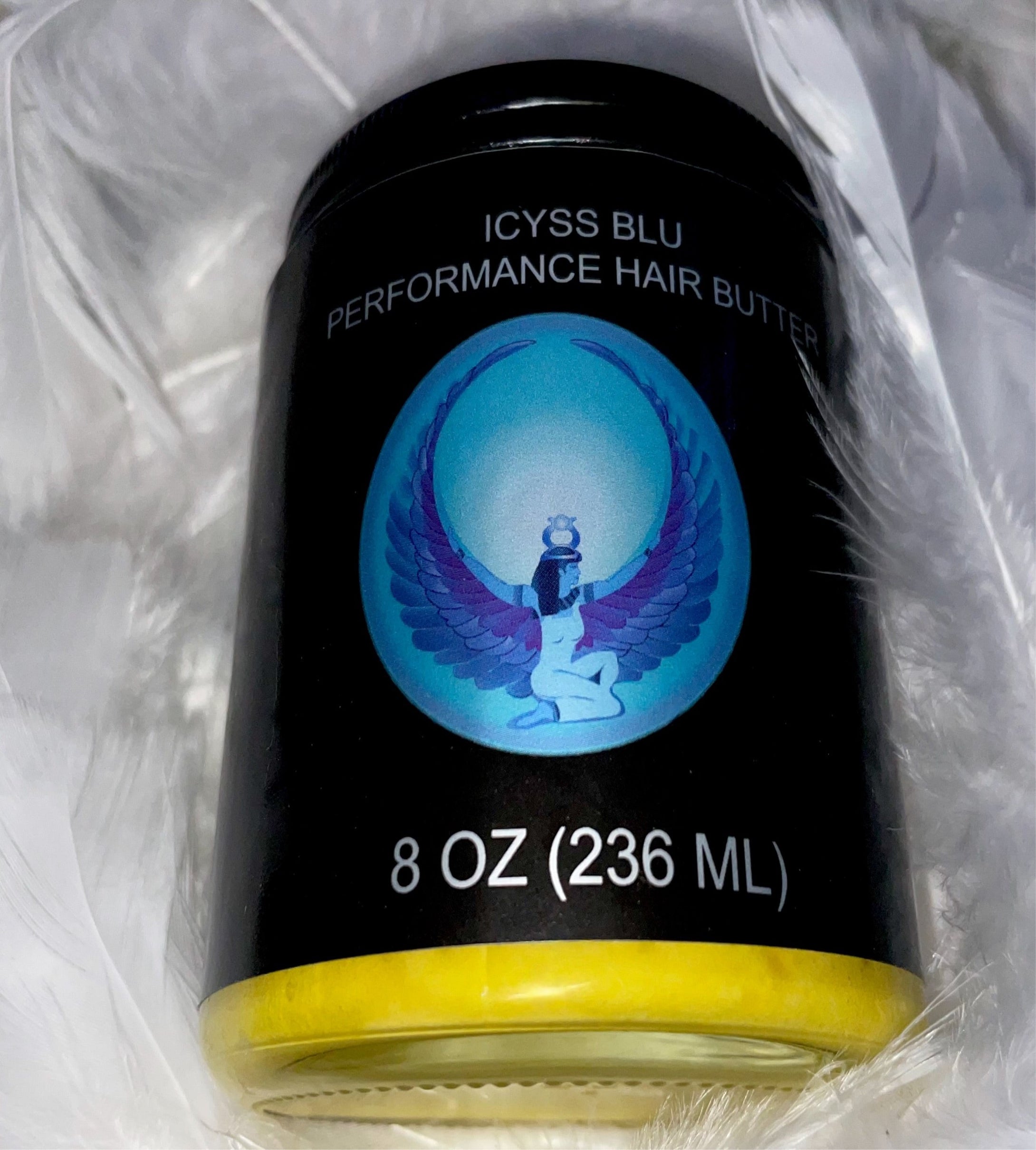 Unrefined African Shea Butter, Extra Virgin Olive Oil, Unrefined Coconut Oil, Peppermint Oil Jamaican Black Castor Oil, Jojoba Oil, Grape-seed Oil and other natural Herbs and oils added to create ICYSS BLU Performance Hair Butter. No Preservatives, No alcohol, NO TESTING ON ANIMALS.